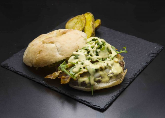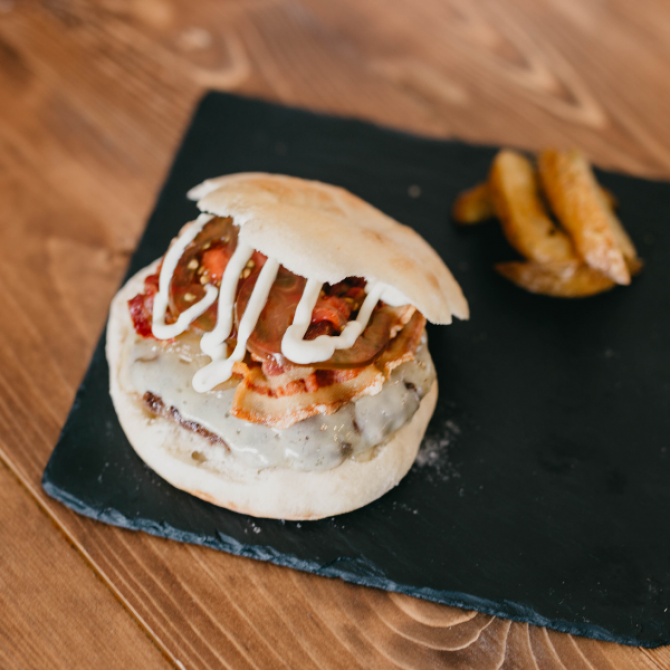 180gr de Wayu 100% de Teruel, panceta, crunch, havarti, cebolla, tomate negro, mayonesa japonesa ¡B-U-E-N-I-S-I-M-A!